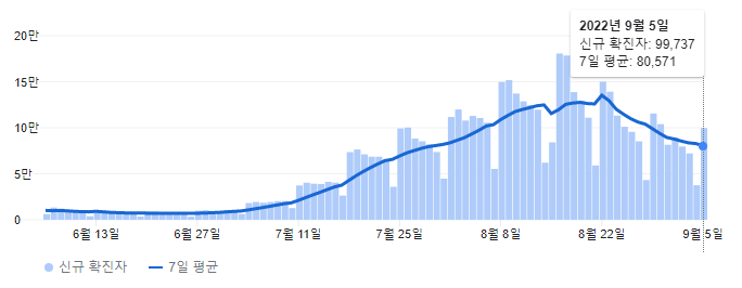 9월 6일 기준, 지난 3개월간 코로나 증가는 아래와 같습니다. 지난번 코로나 확진자수가 굉장히 급증했을 때 주변 사람들도 많이 확진되었는데, 당시 확진되지 않았던 사람들도 결국 다 확진되고 있습니다.